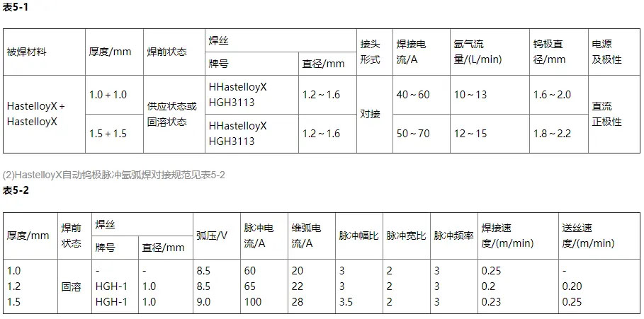 (1)HastelloyX手工氬弧焊對接規范見表5-1
