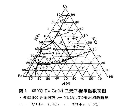 Incoloy 800合金是Fe-Cr-Ni基合金,Bcadley提供Fe-Cr-Ni三元平衡相圖(見圖