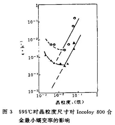 Incoloy 800合金高溫蠕變(持久性能)是主要的性能指標,要求33MPa應力下斷裂時間超過1000h。在許多情況下粗晶粒材料比細晶粒材料的蠕變率低,而應變一斷裂強度則高。一個簡單化的解釋就是,與細晶粒材料相比,粗晶粒材料可供晶界滑動的晶界總面積較小。在若干種合金中都已觀察到了產生最大蠕變抗力的最佳晶粒度(如圖3所示),晶粒的大小如果超出此臨界值,穩態蠕變率就會上升。美國標準ASTM對Incoloy800H合金要求晶粒度2~5級,晶粒直徑為(1.8×10-²cm~0.62×10-²cm)正處于最佳晶粒度,保證最小蠕變率。